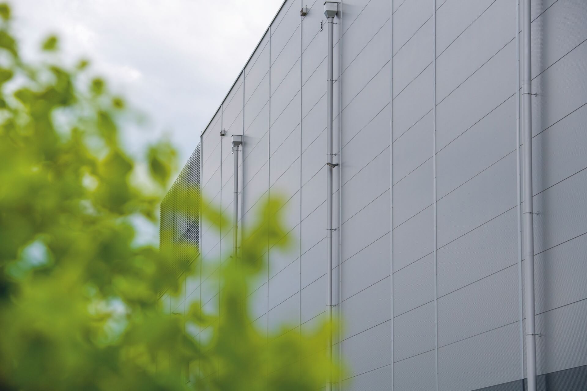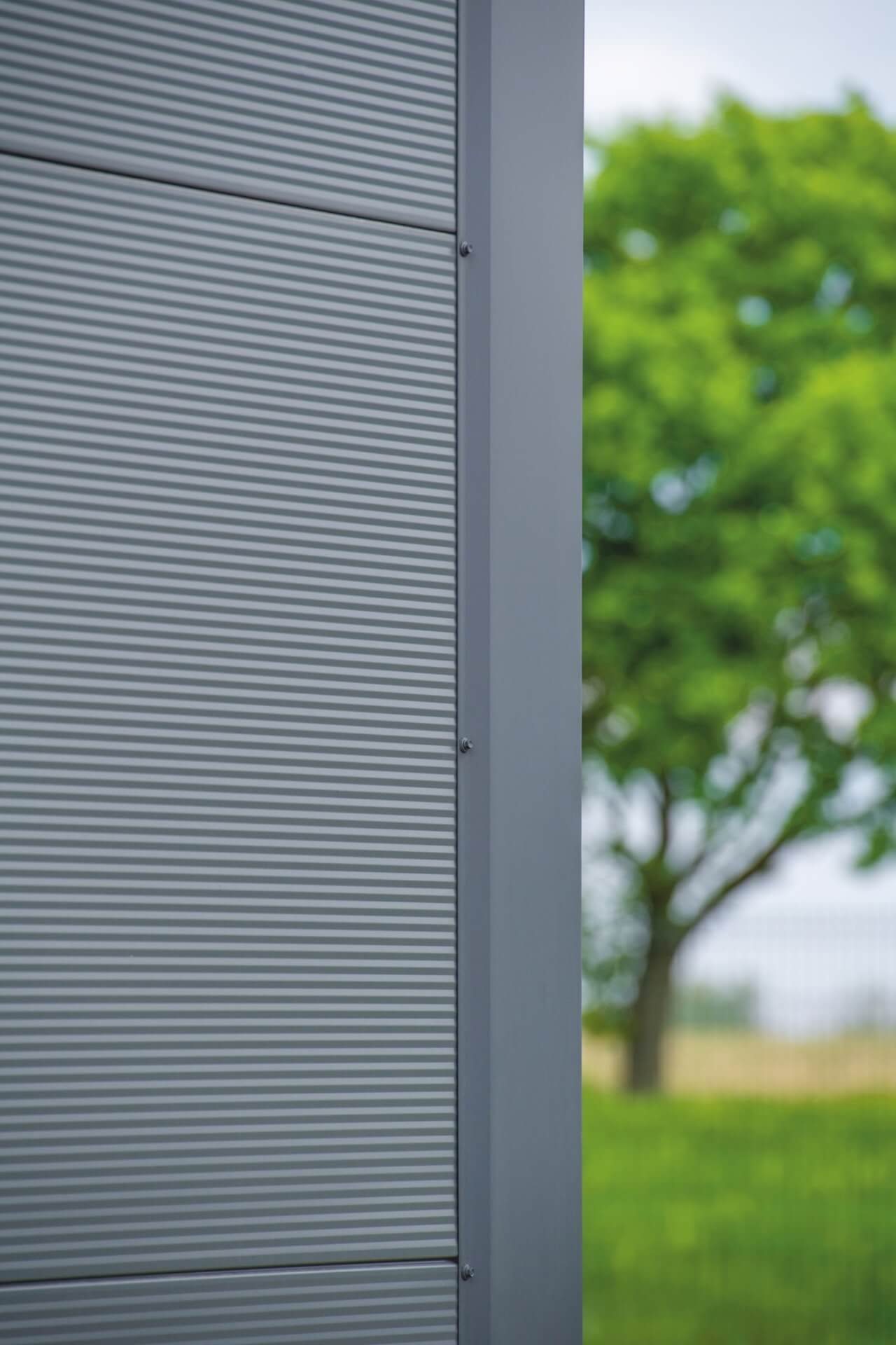 Pastato išorinių sienų apdailai buvo panaudotos sieninės daugiasluoksnės plokštės ARPANEL S MiWo su mineralinės vatos užpildu, spalvos RAL 9006 ir RAL 7024.![]()