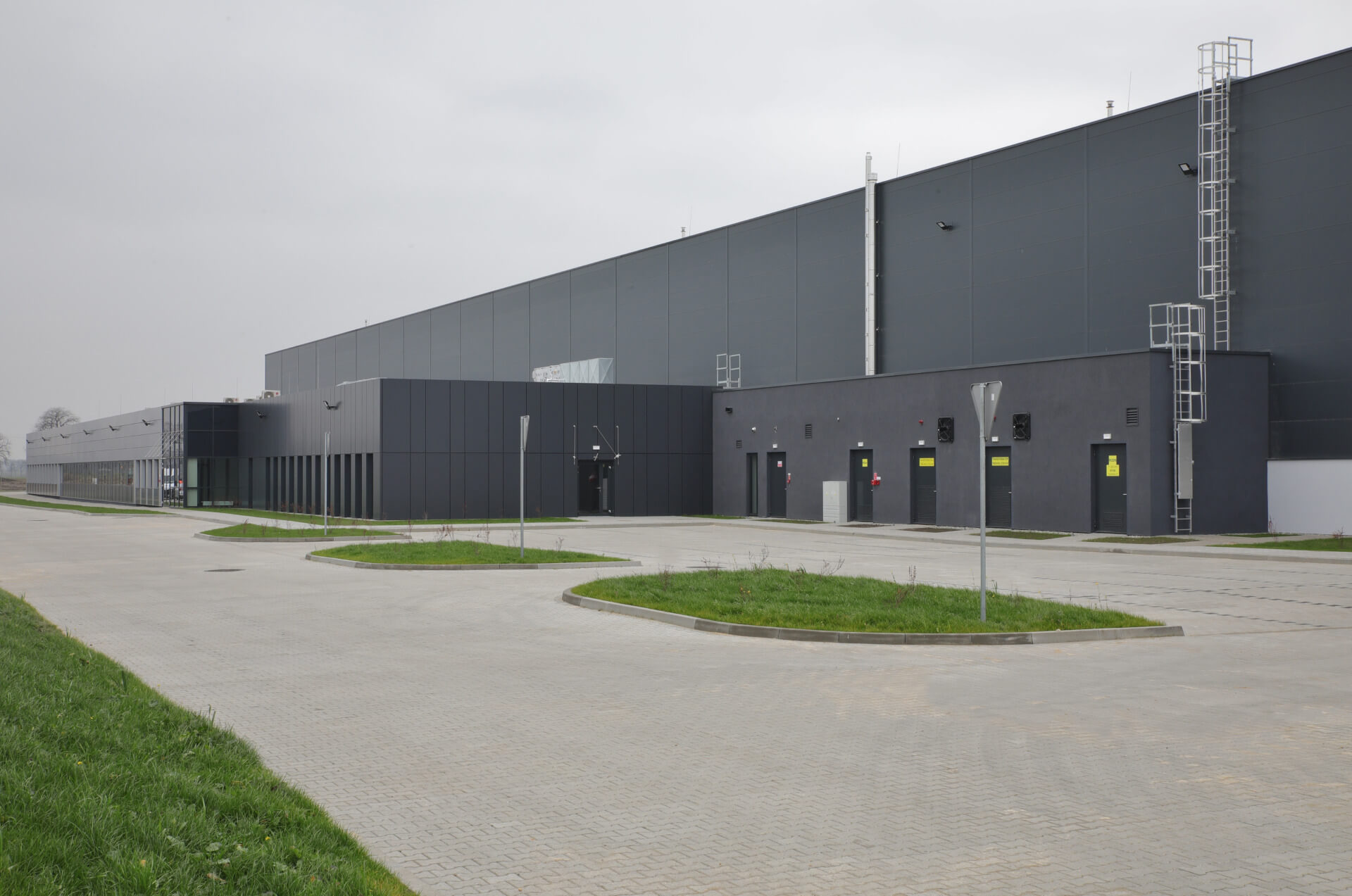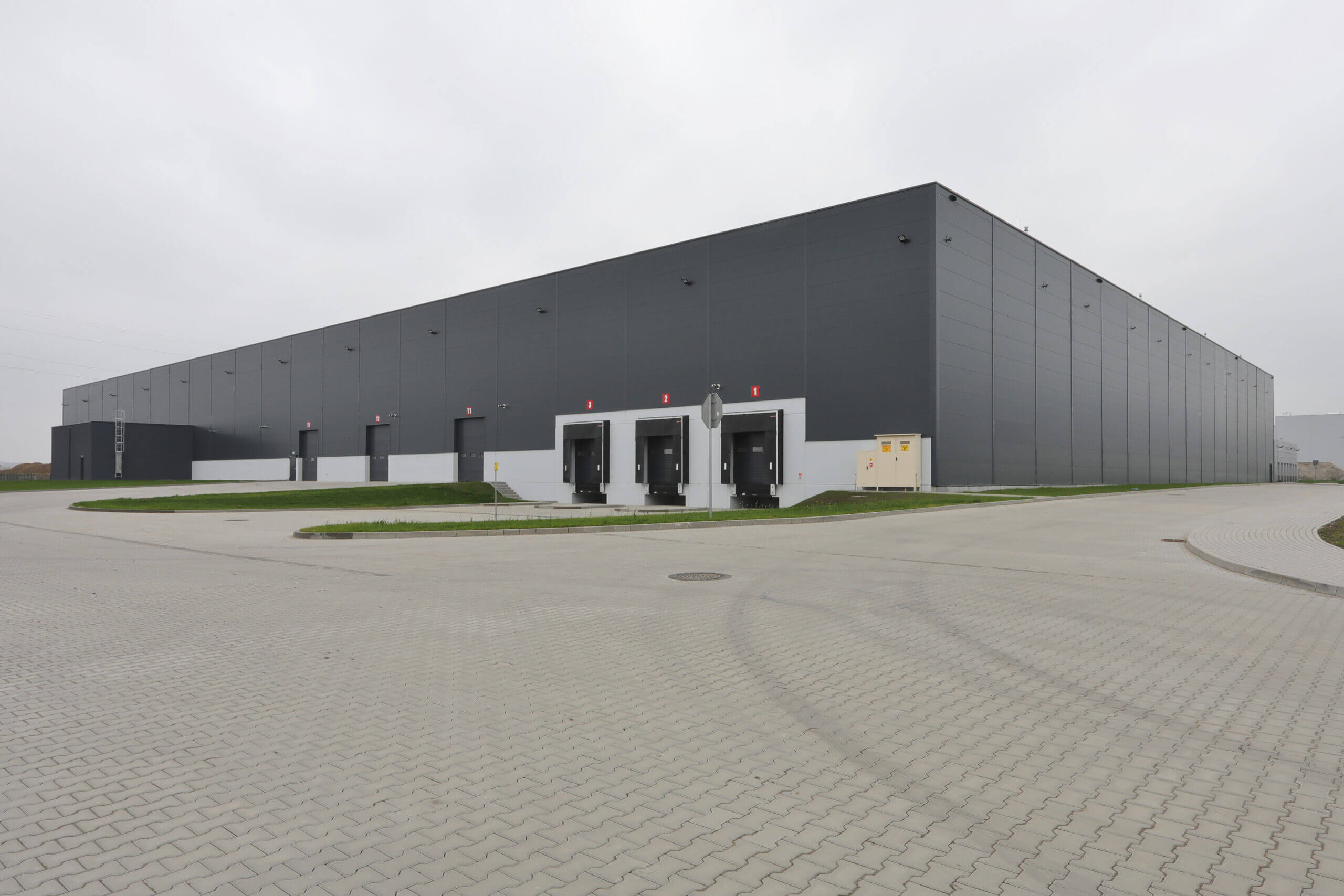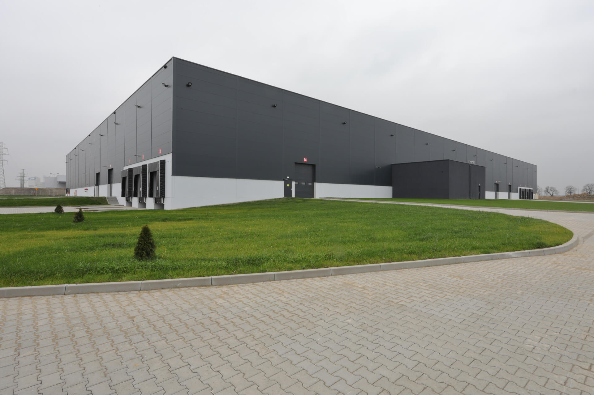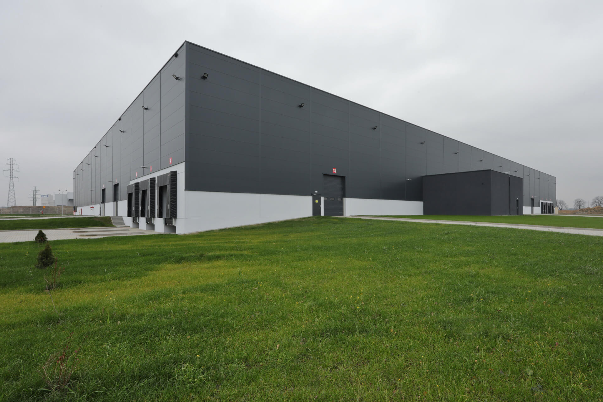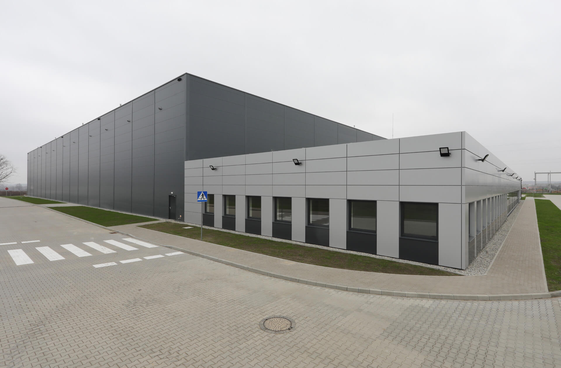 Didelio ploto sandėlis mieste Gliwice, kuriame naudojamos sieninės daugiasluoksnės plokštės ARPANEL S MiWo, spalva RAL 7016.🕋📦🏭